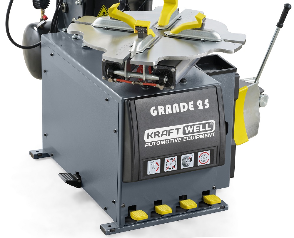 - Шиномонтажный станок KraftWell GRANDE 25/220, KRW25A/220, серый, автомат, 220В, 1 скорость, для дисков 10-26″, 8-10 бар