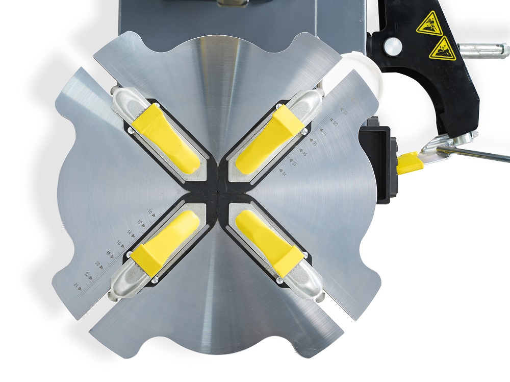 - Поворотный стол специальной формы с самоцентрирующимся четырехчулачковым механизмом зажима дисков надежно фиксирует колеса диаметром до 1040 мм