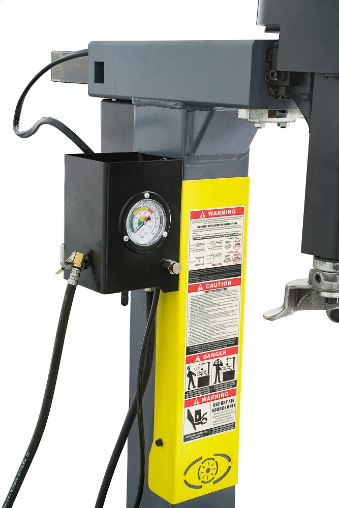 - Манометр на колонне с шлангом для подкачки шин. Управление накачкой производится педалью в левой части корпуса станка