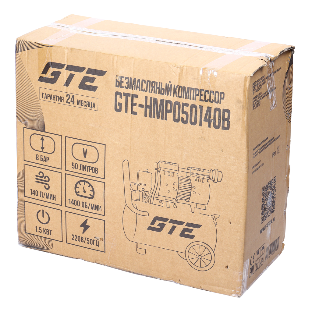 - Компрессор пневматический 220В 1.5кВт 8атм.140л/мин. ресивер-50л поршневой безмасляный GTE GTE-HMP050140B