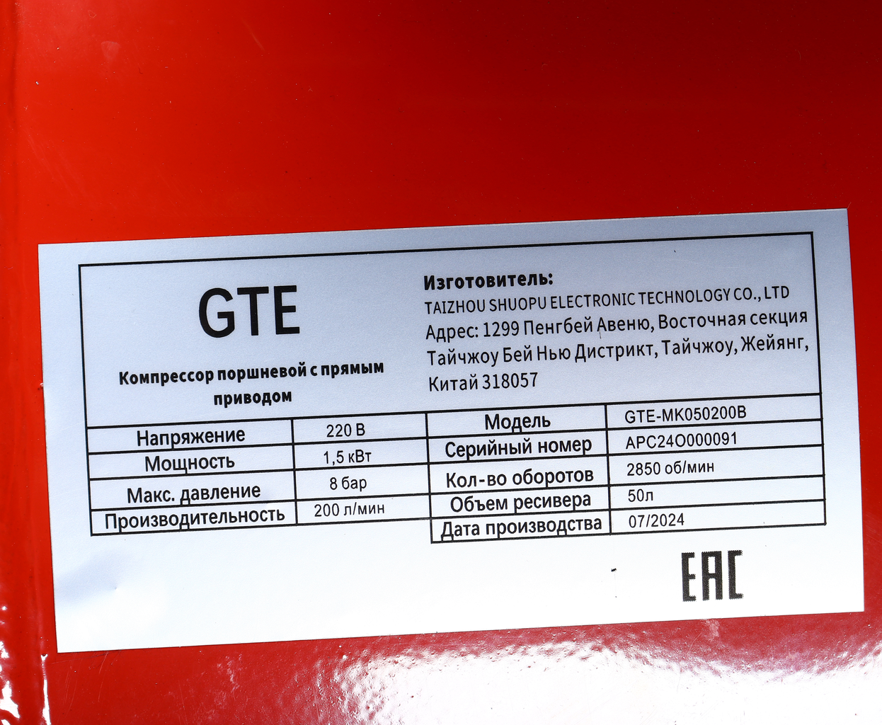 - Компрессор пневматический 220В 2.2кВт 8атм. 200л/мин. ресивер-50л поршневой с прямым приводом GTE GTE-MK050200B