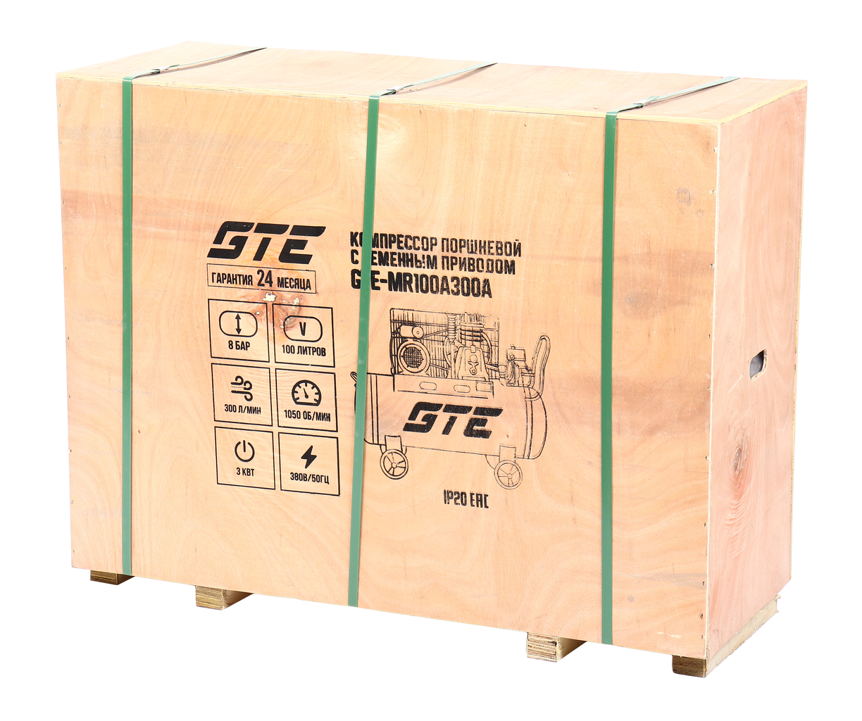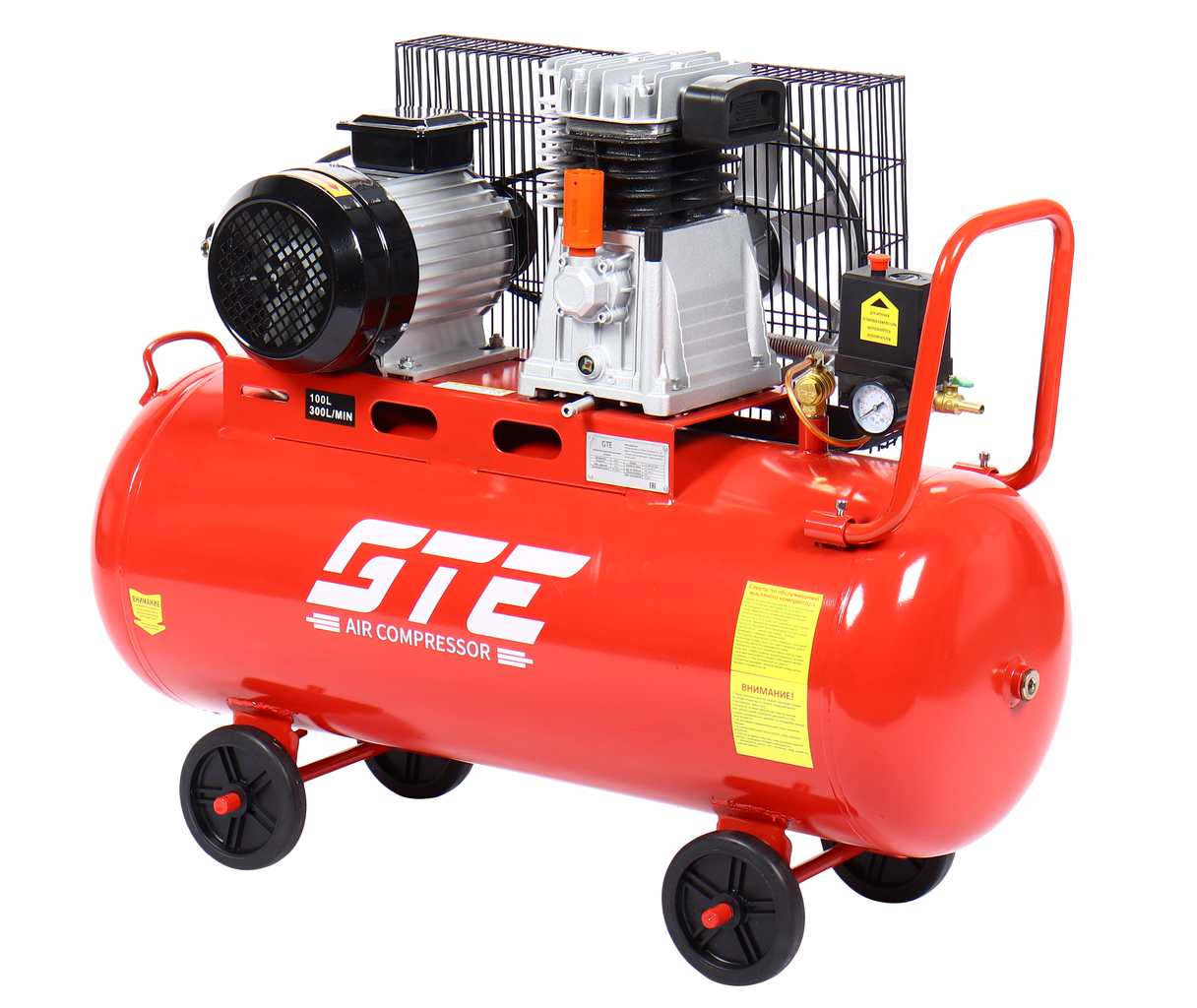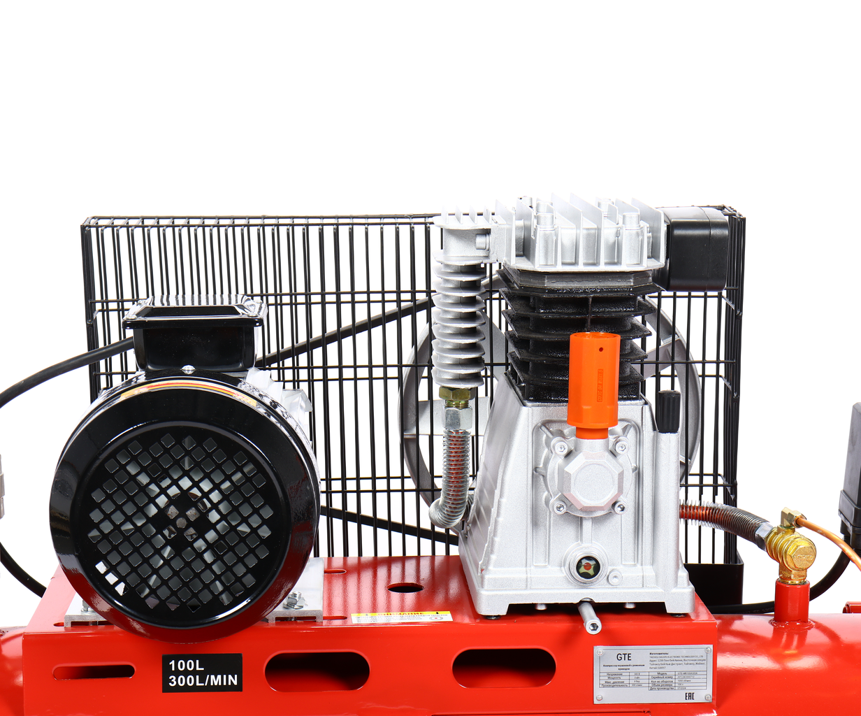 - Компрессор пневматический 380В 3.0кВт 8атм. 300л/мин. ресивер-100л поршн. ремен. одноступенчатый GTE GTE-MR100A300A