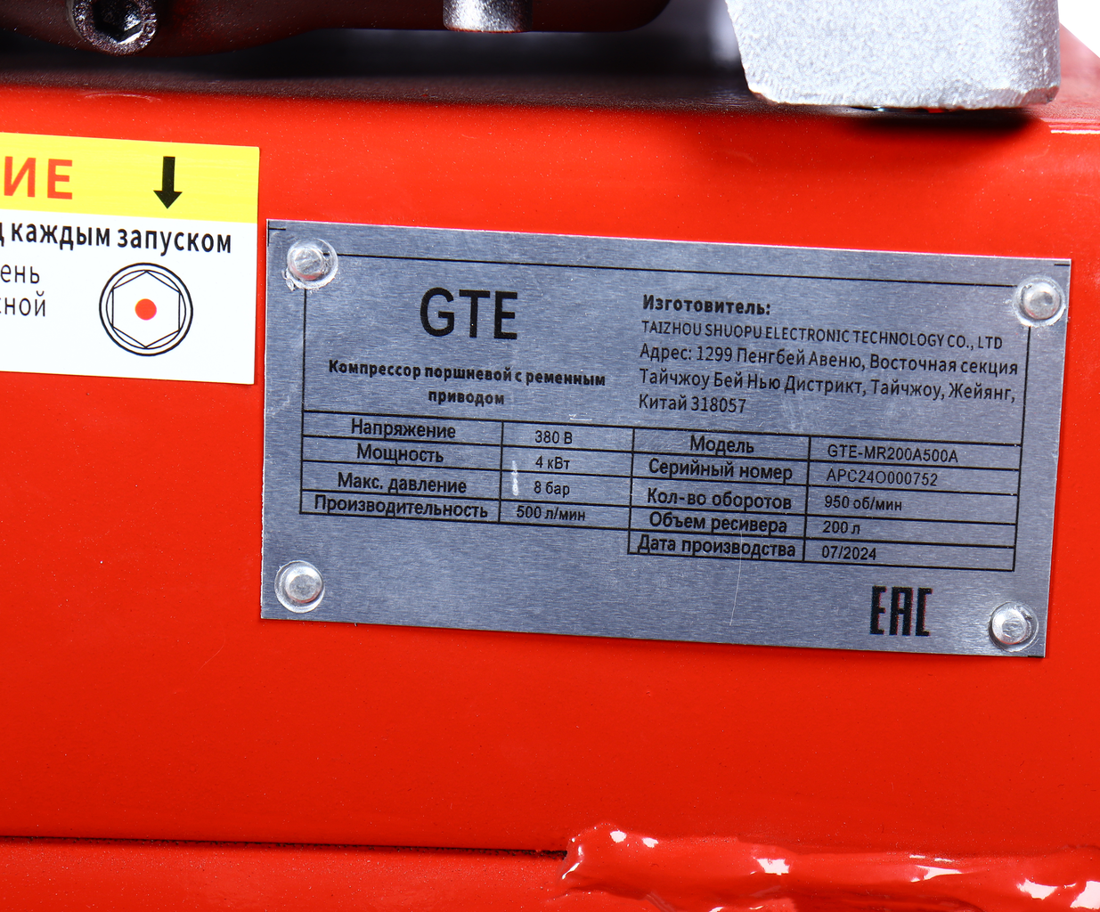- Компрессор пневматический 380В 4.0кВт 8атм. 500л/мин. ресивер-200л поршн. ремен. одноступенчатый GTE GTE-MR200A500A