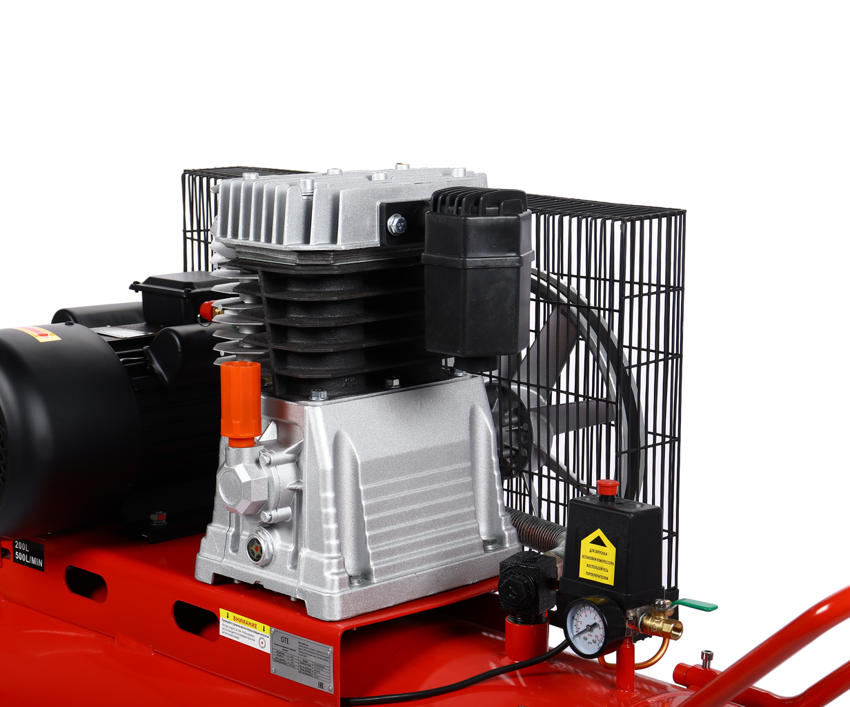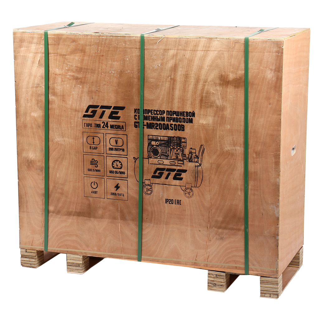 - Компрессор пневматический 220В 4.0кВт 8атм. 500л/мин. ресивер-200л поршн. ремен. одноступенчатый GTE GTE-MR200A500B