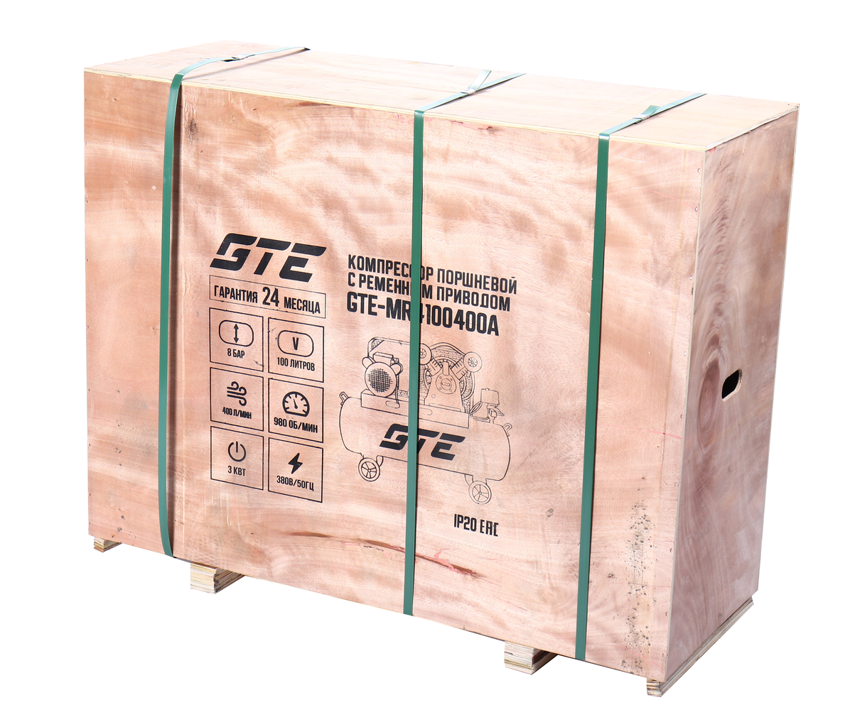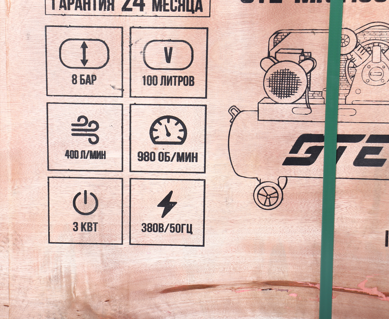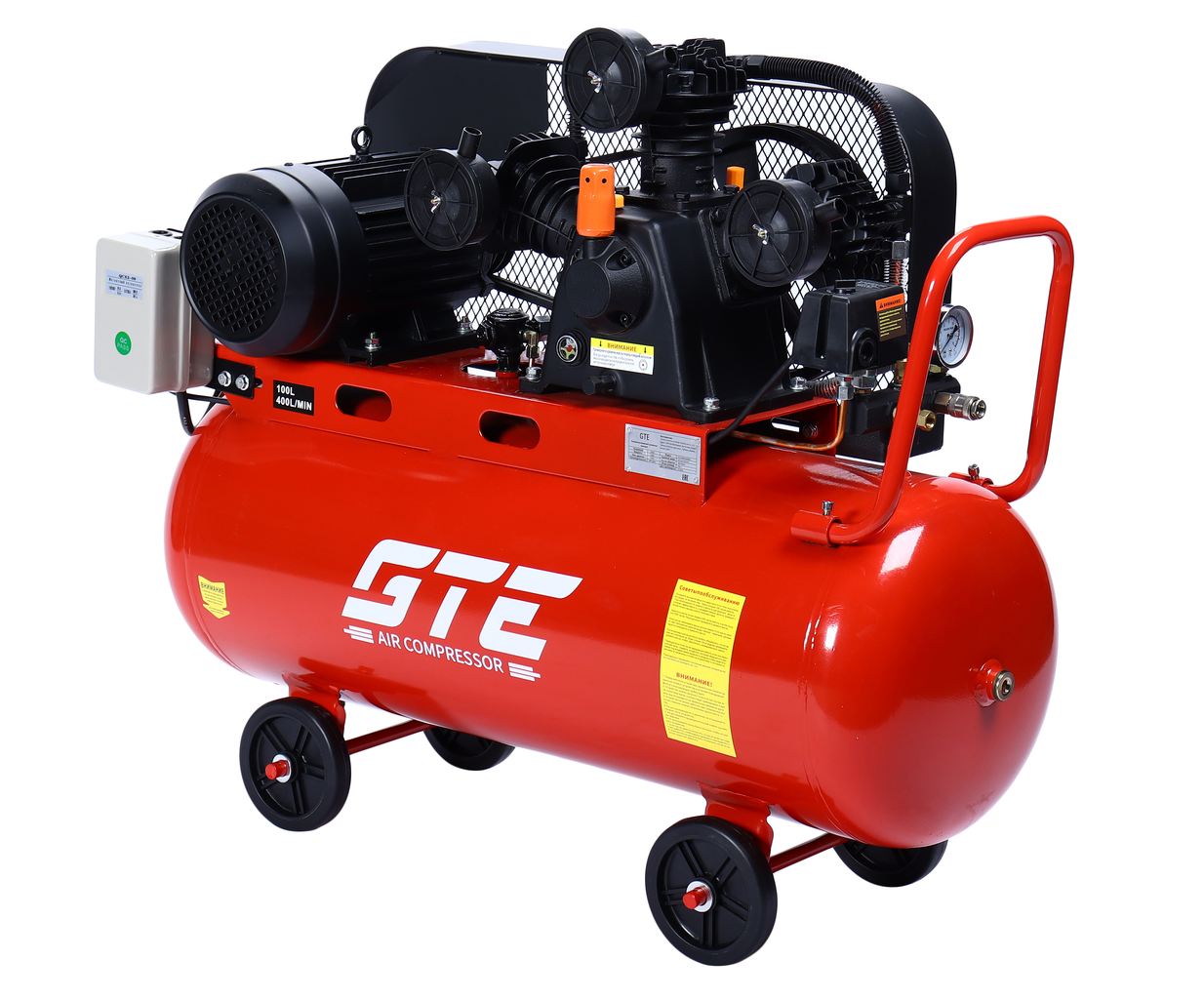 - Компрессор пневматический 380В 3.0кВт 8атм. 400л/мин. ресивер-100л поршневой ременной GTE GTE-MR4100400A