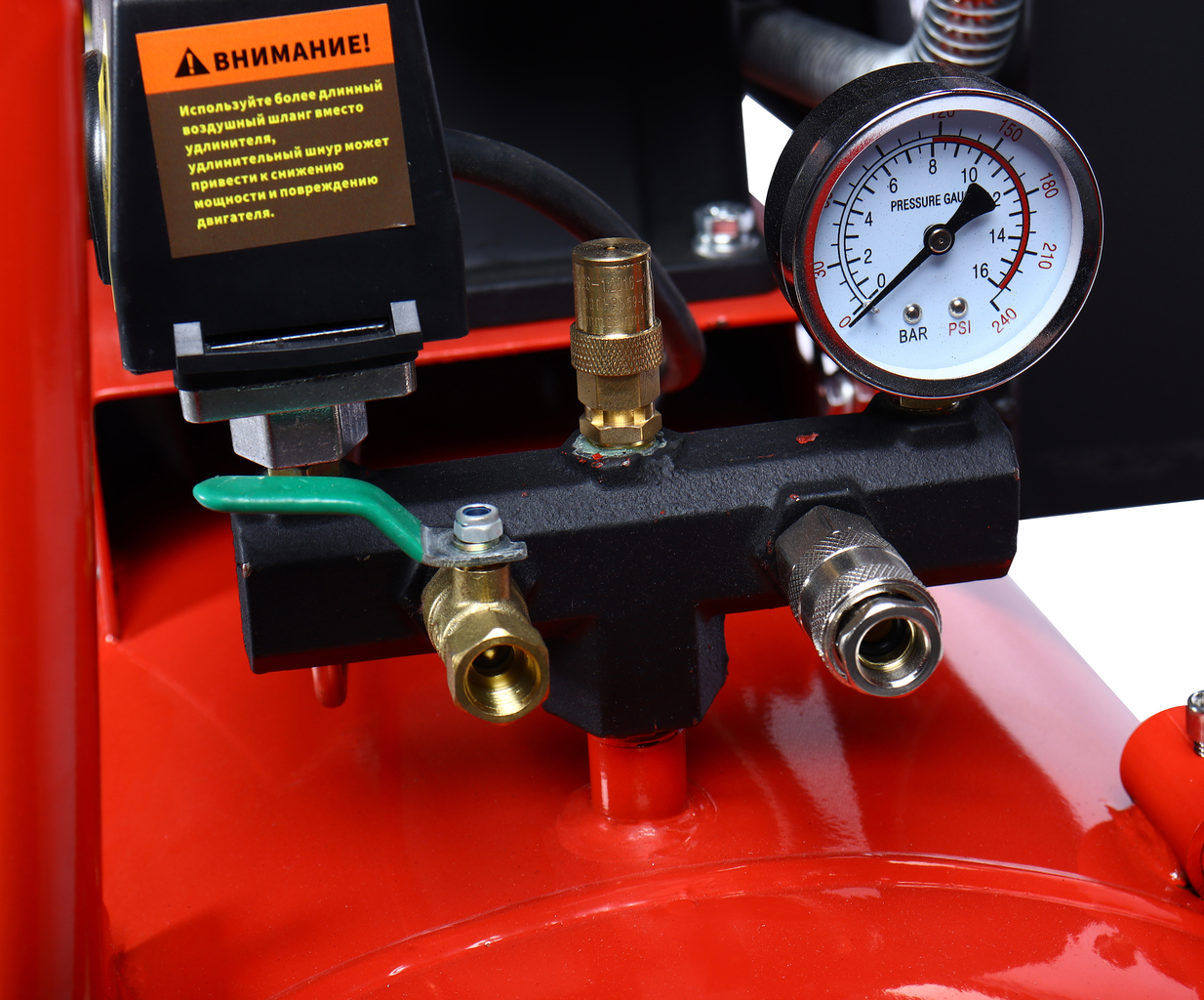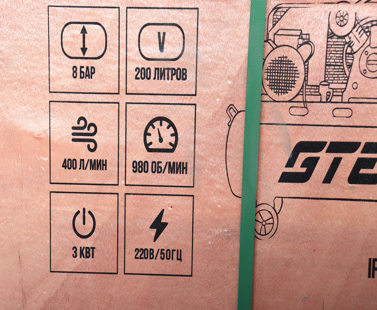 Ресивер объемом 200 литров — обеспечивает достаточный запас воздуха для многих задач, позволяя работать без частых отключений.
