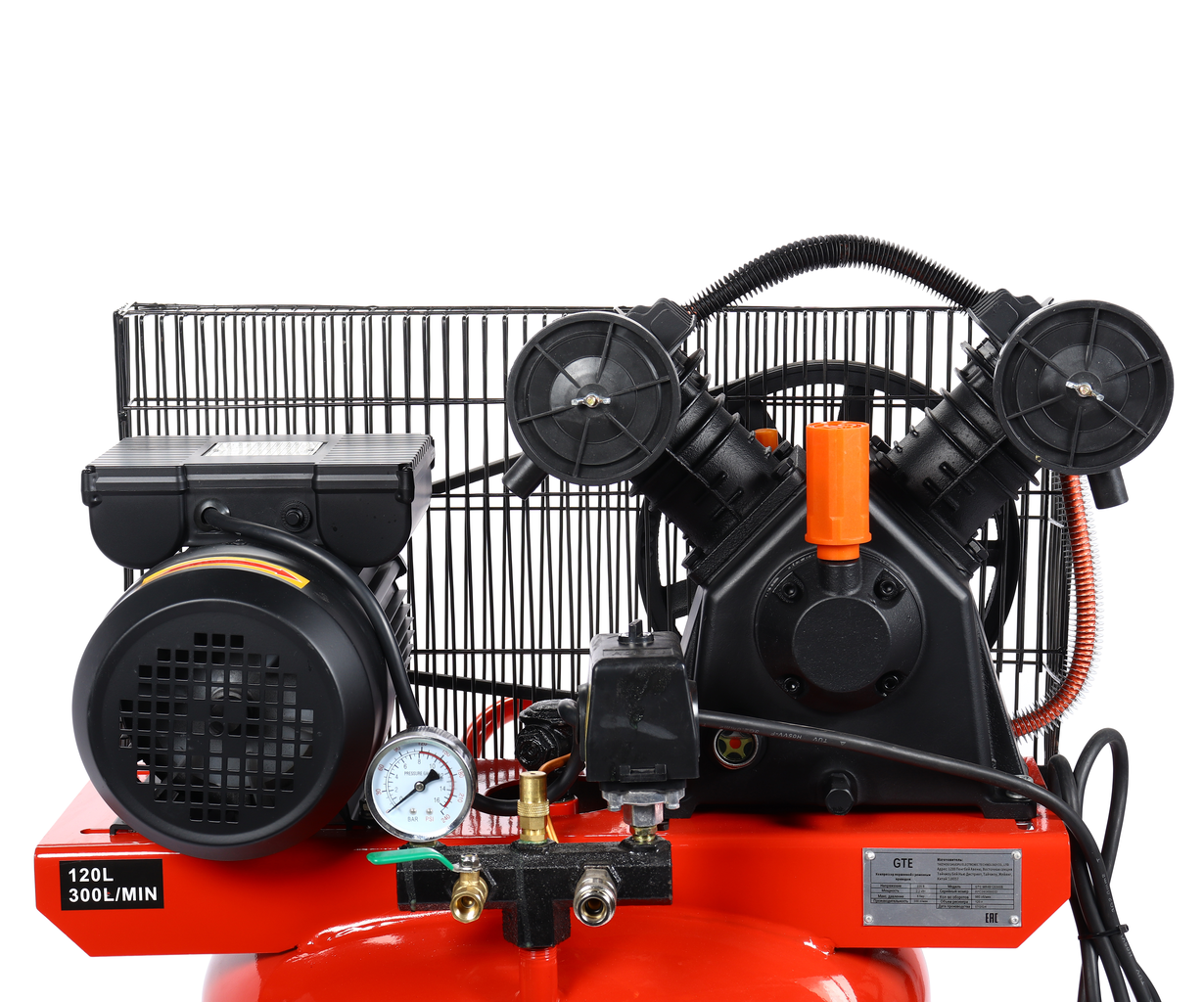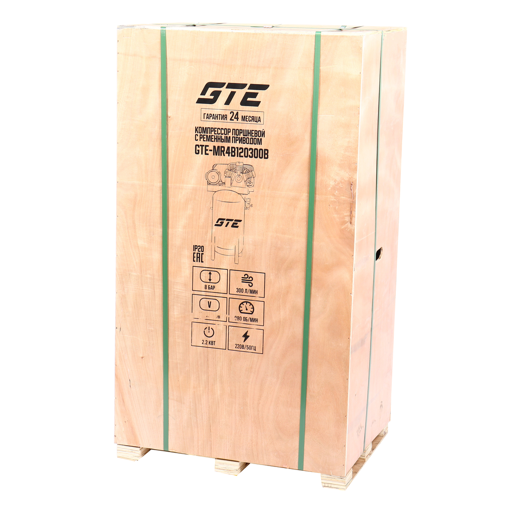- Компрессор пневматический 220В 2.2кВт 8атм. 300л/мин. ресивер-120л поршн. ремен. вертикальный GTE GTE-MR4B120300B