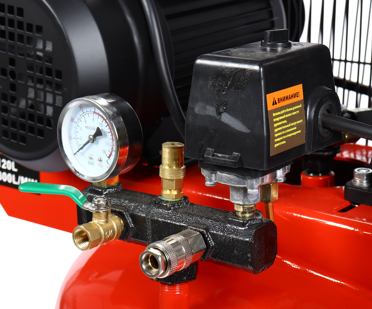 Ресивер объемом 120 литров — обеспечивает достаточный запас воздуха для многих задач, позволяя работать без частых отключений.