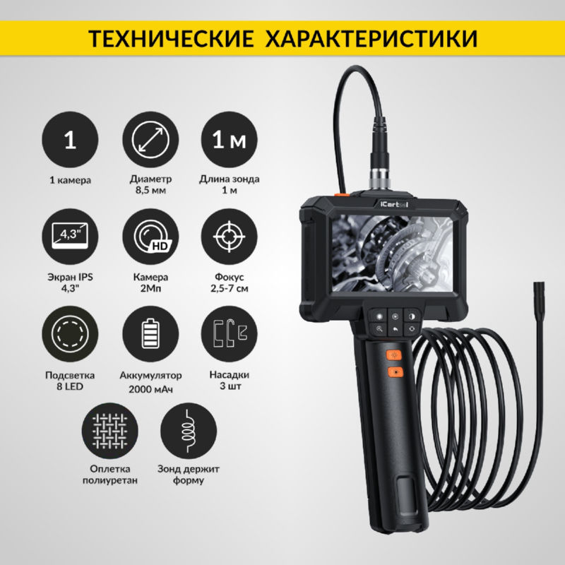 Видеоэндоскоп промышленный с зондом 8.5 мм х 1 метр и камерой 2 Мп iCartool IC-VC81, черный, 2000 мАч, дисплей 4.3″/1280х720, IPX7, время работы до 3,5 ч, кабель Type-C