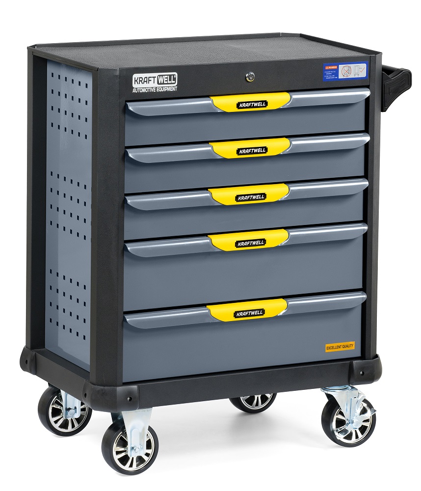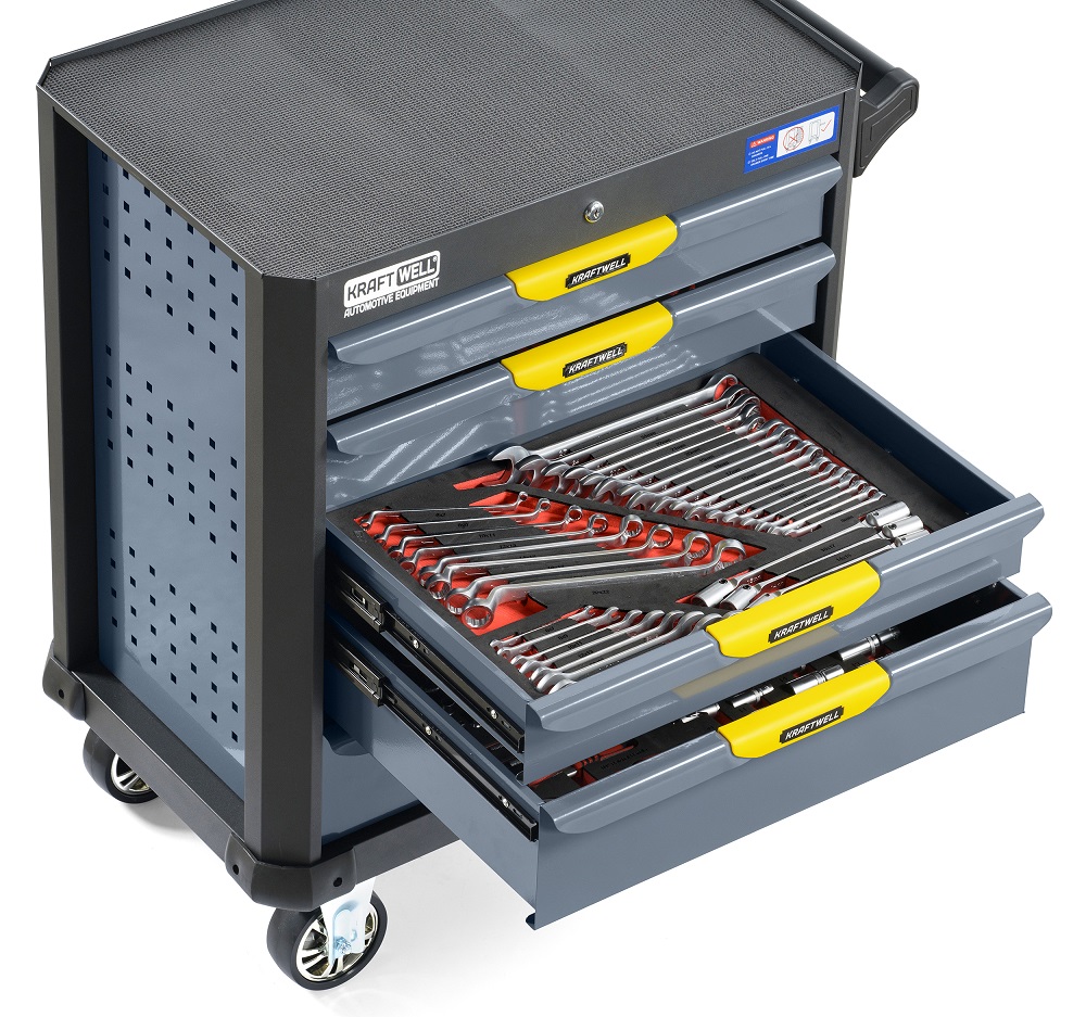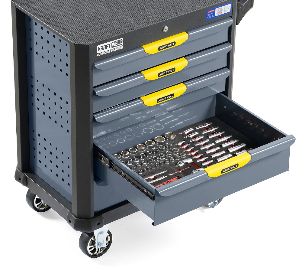 KraftWell KRW-TTG/SET157 – это тележка инструментальная с 5 выдвижными ящиками на телескопических направляющих с фиксацией и доводчиком серого цвета с комплектом инструмента из 157 предметов на 4 ложементах, применяемая для компактного размещения и доставки необходимого инструмента непосредственно к месту проведения работ в условиях в гаражей, автосервисов, цехов, мастерских и учебных заведений.