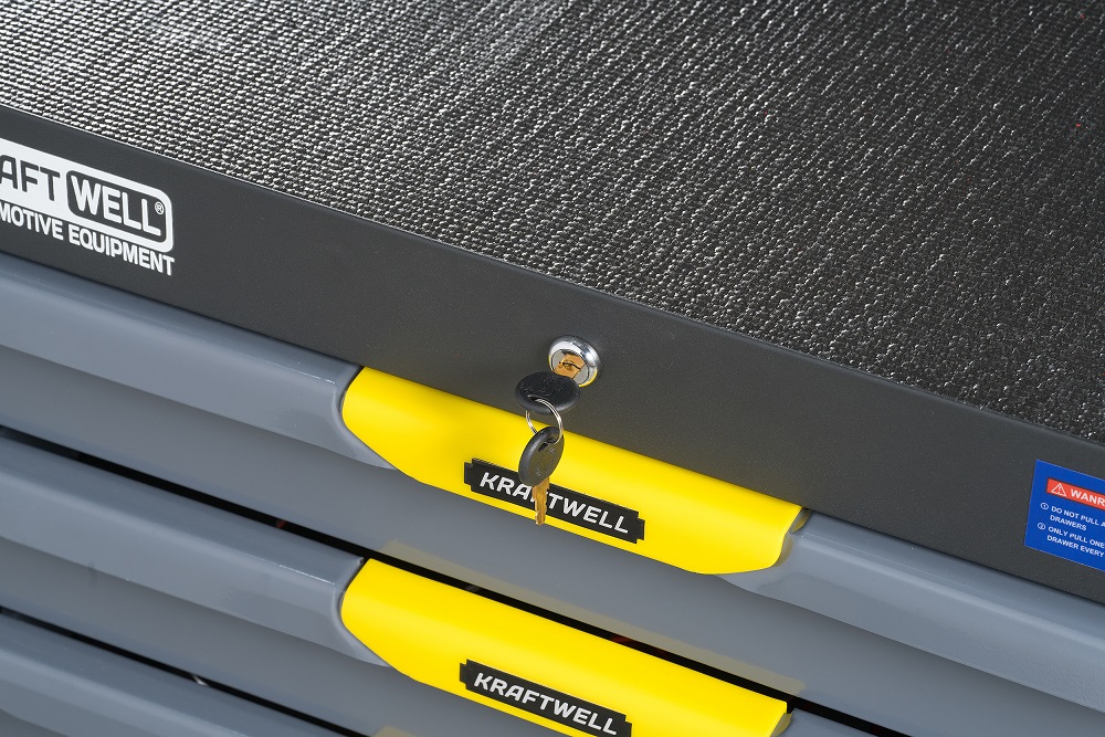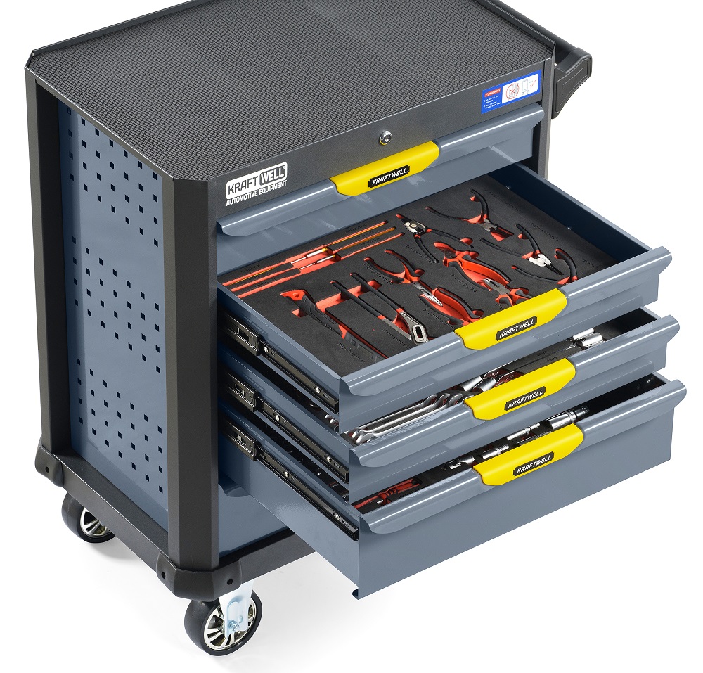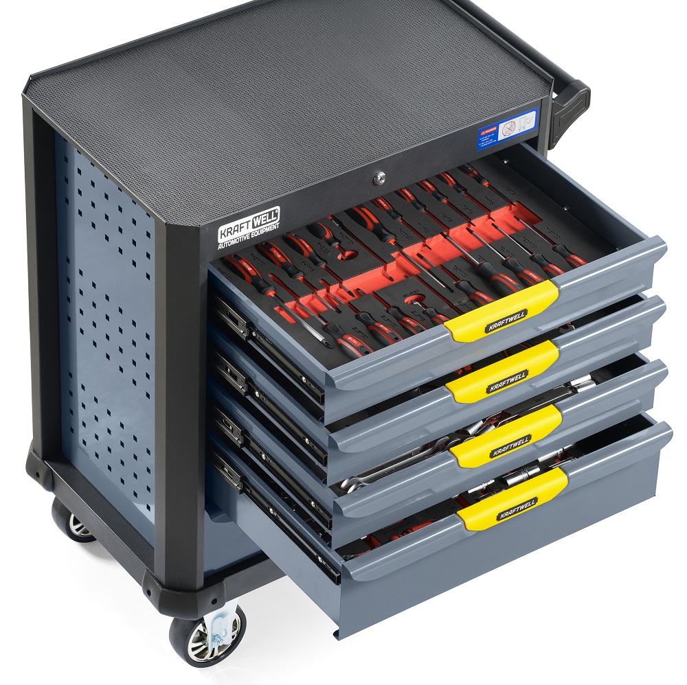 - Инструментальная тележка KraftWell KRW-TTG/SET157 оснащена 5-ю выдвижными ящиками, 4 из которых укомплектованы ложементами с инструментом (157 предметов)