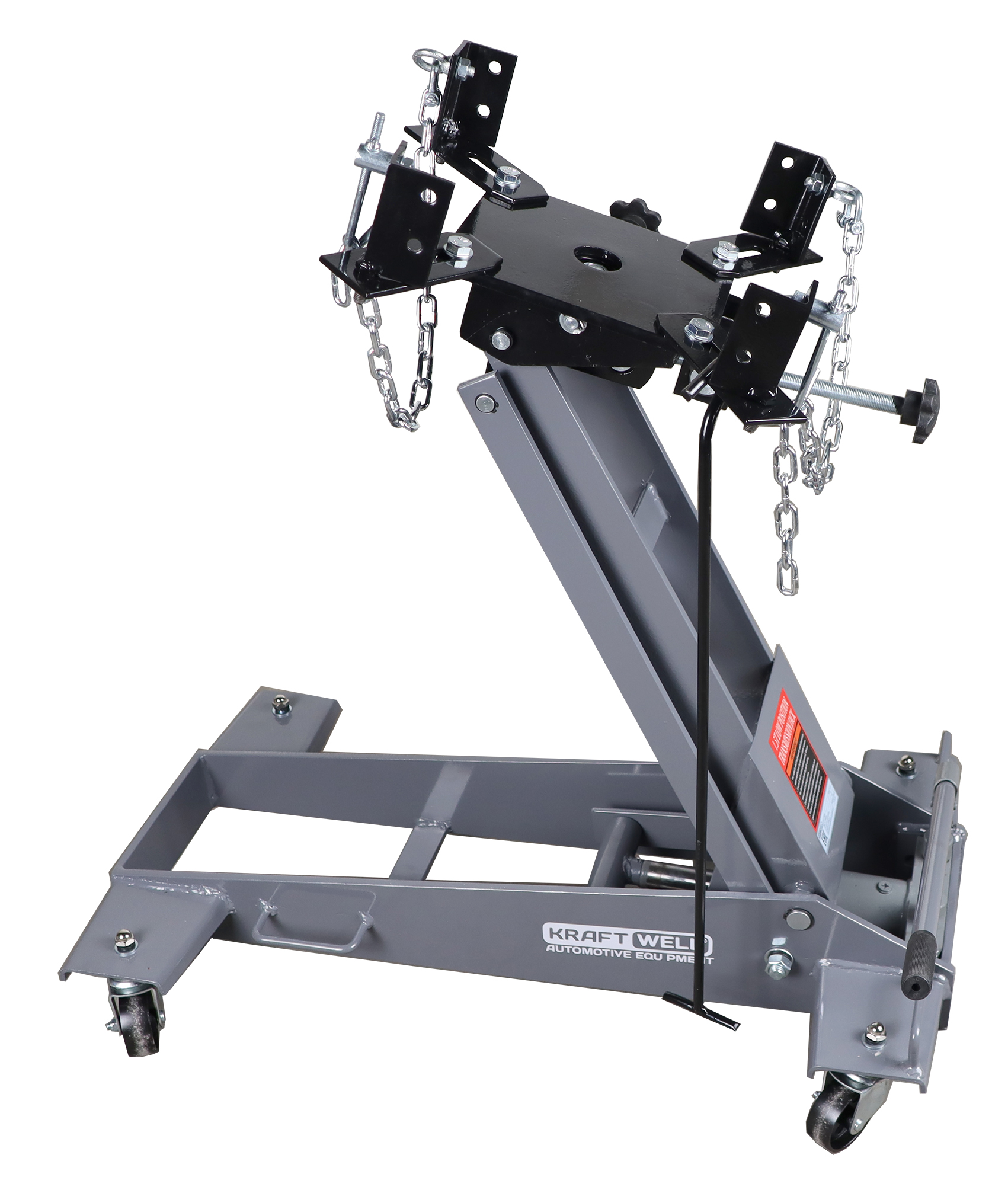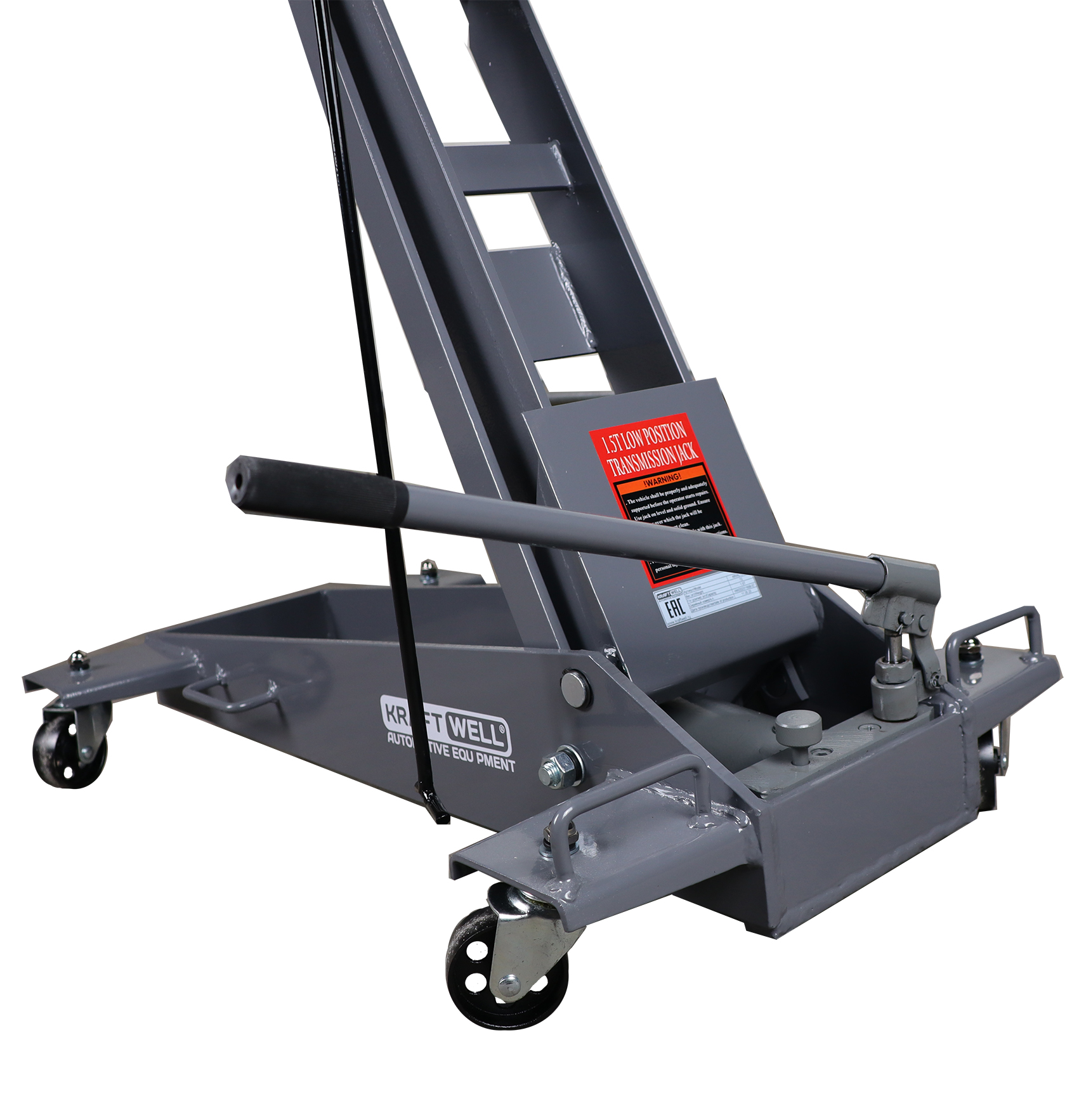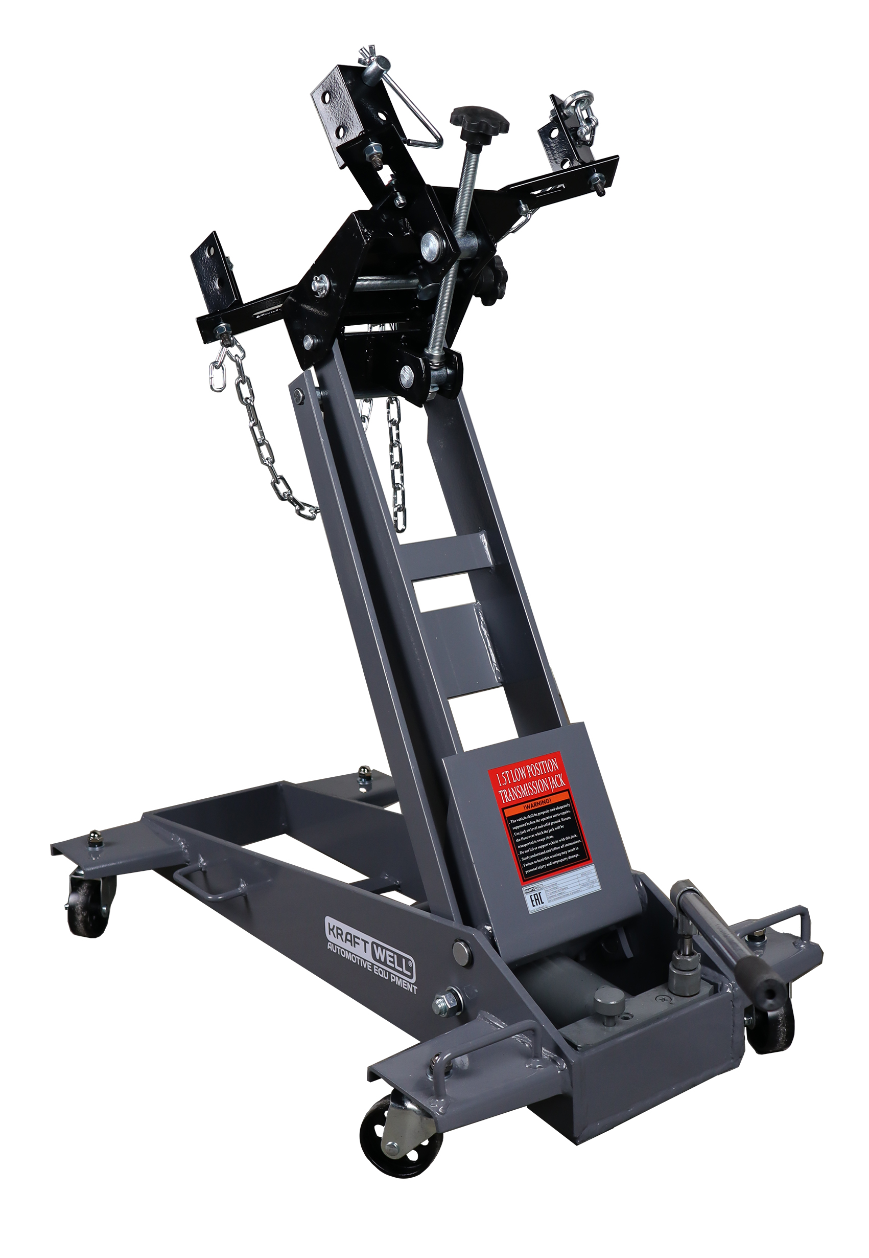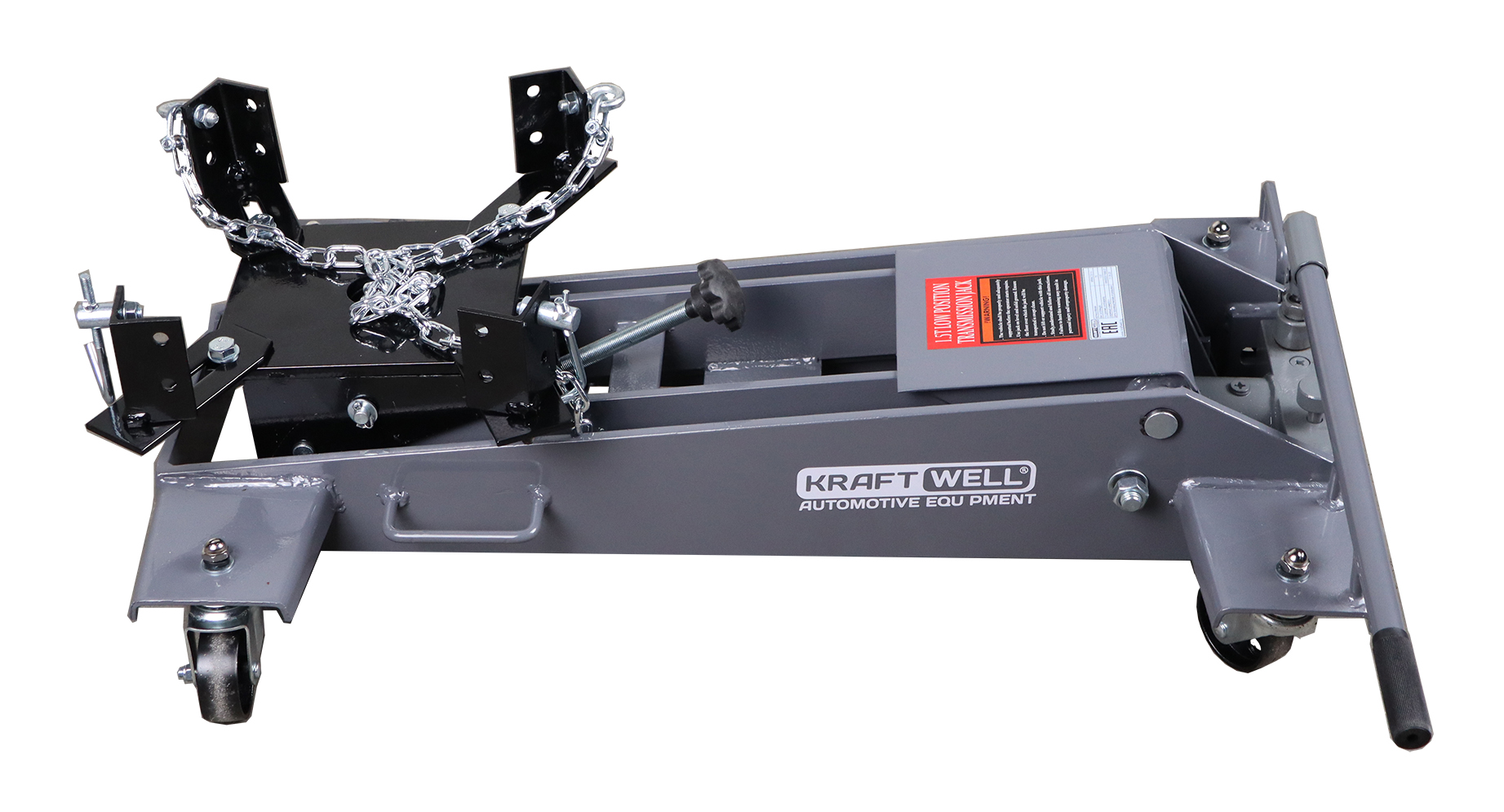 KraftWell KRWLTJ1.5 – это гидравлическая подкатная трансмиссионная тележка грузоподъемностью 1500 кг с регулируемыми подхватами, применяемая для снятия и установки автомобильных коробок передач, элементов выхлопной системы, топливных баков. в условиях автосервисов и СТО.