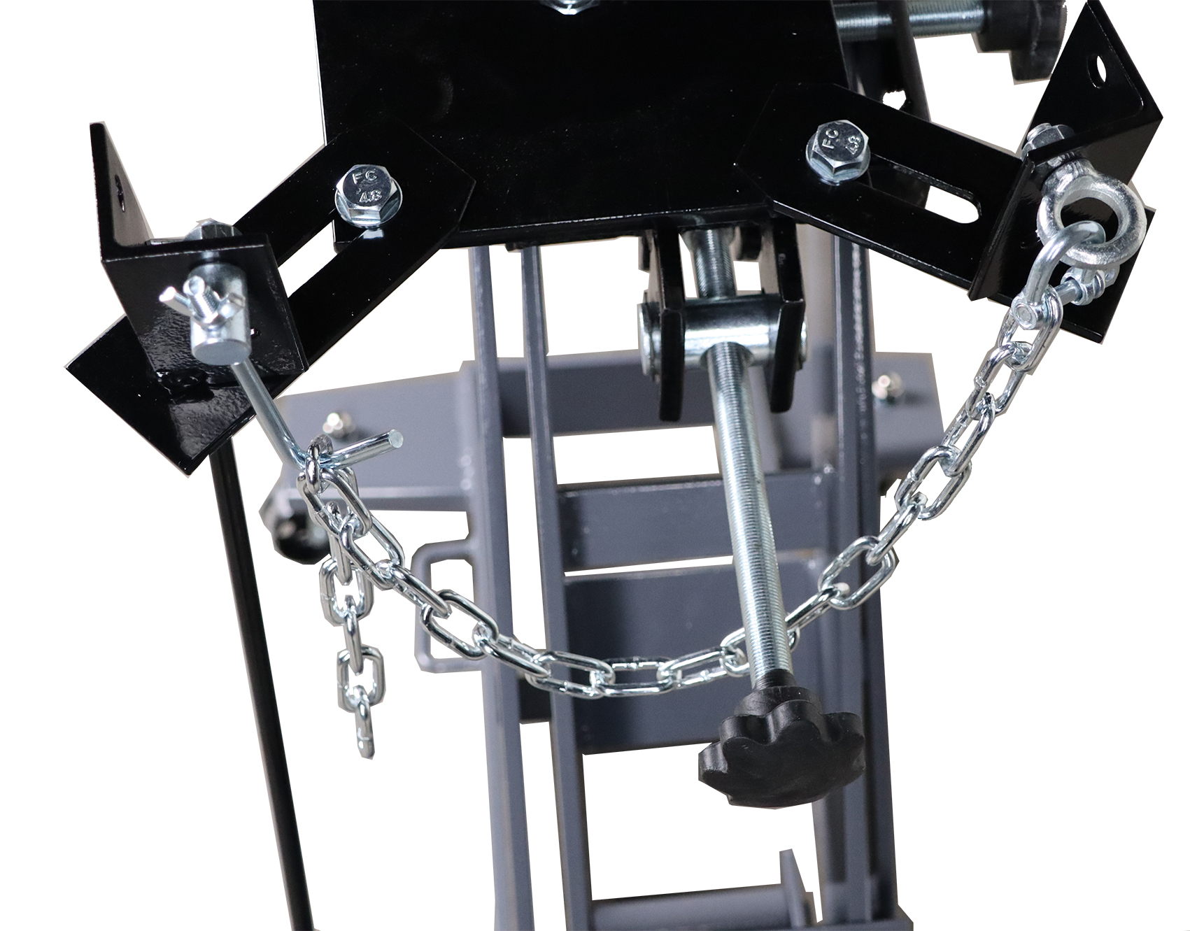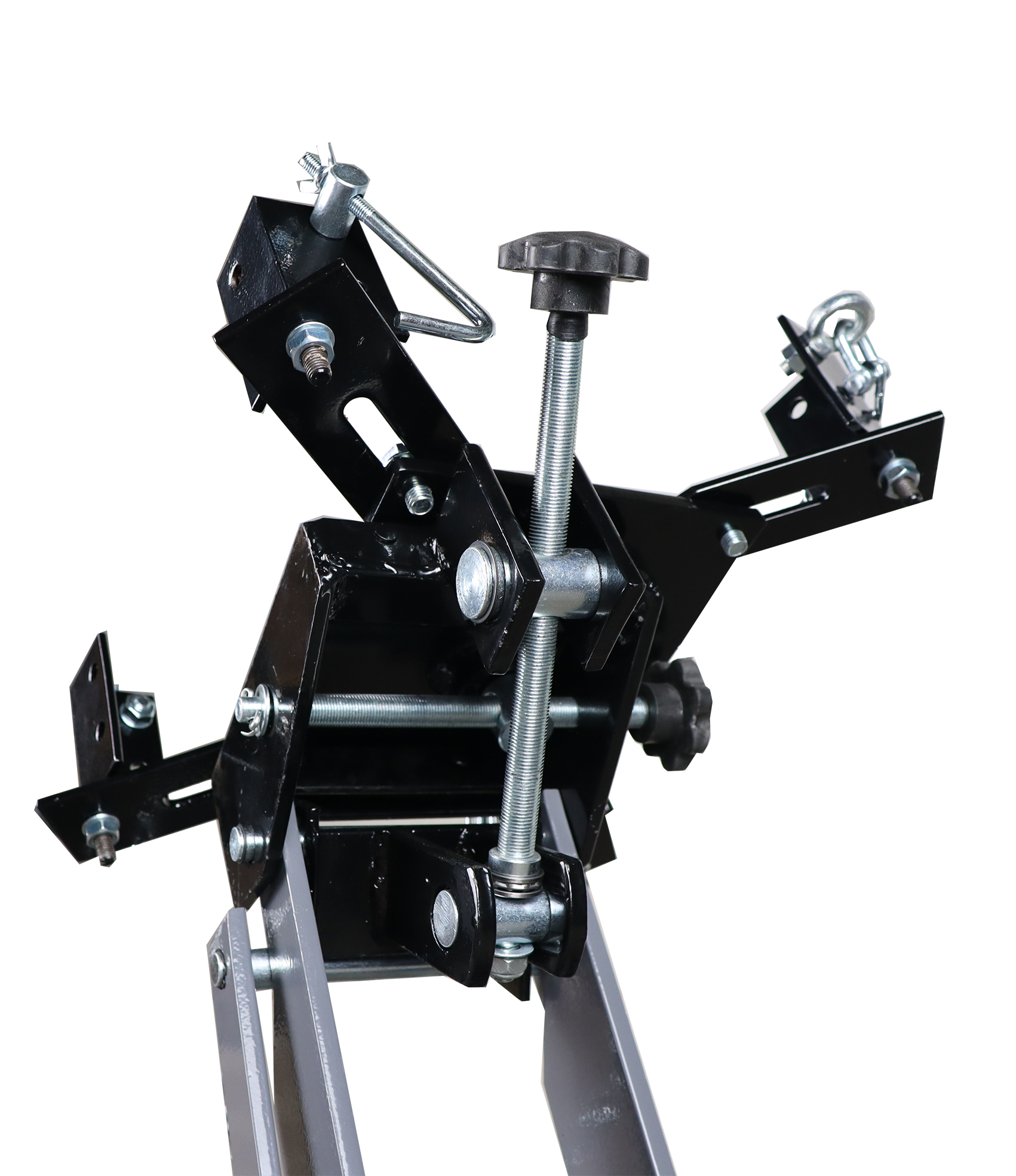 - Подкатная трансмиссионная тележка KraftWell KRWLTJ1.5, серая, гидравлическая, до 1500 кг, подъем 230-880 мм, регулировка наклона при помощи винта