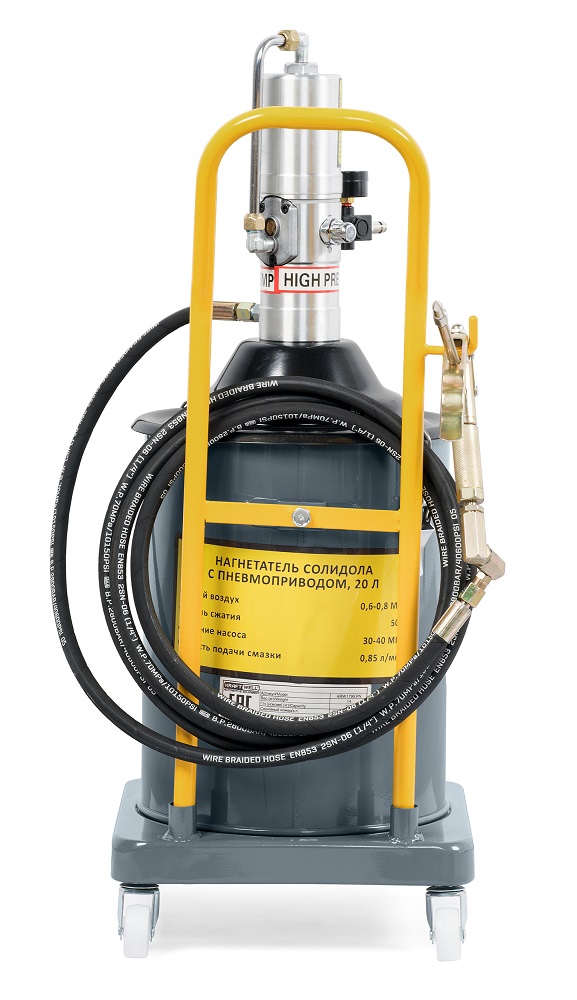 Нагнетатель солидола с пневмоприводомKRW1799.PNработает от линии сжатого воздуха давлением 6-8 бар. Конструкция нагнетателя представляет из себя емкость, рассчитанную на 20 кг солидола, шланг длиной 4 метра, механический пистолет с жестким наконечником. Поворотные колеса, которыми оснащен нагнетатель, позволяет без труда перемещать его по горизонтальной поверхности.