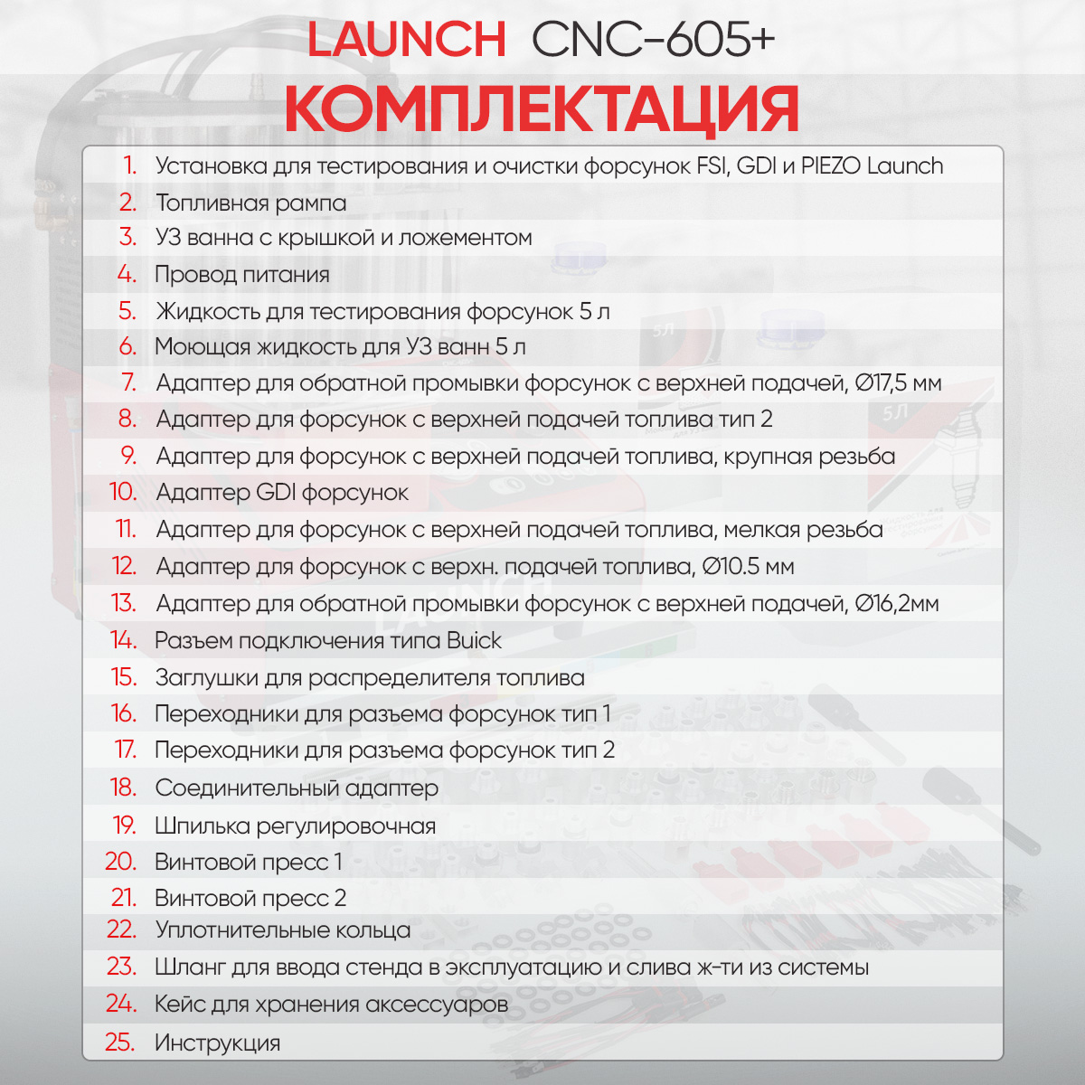 - Launch CNC-605+ (LNC-265) – установка для тестирования и очистки форсунок типа GDI и FSI, а также Piezo.