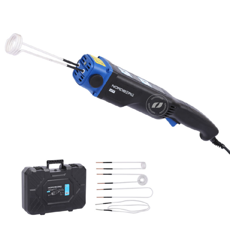 - Индукционный нагреватель в кейсе Nordberg HIF9, черный, 220 В, 10 А, мощность 1100 Вт, нагрев стали до 800°, время нагрева 10-65 сек, принудительное охлаждение, насадки, IP21