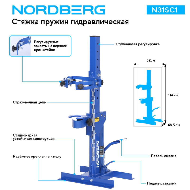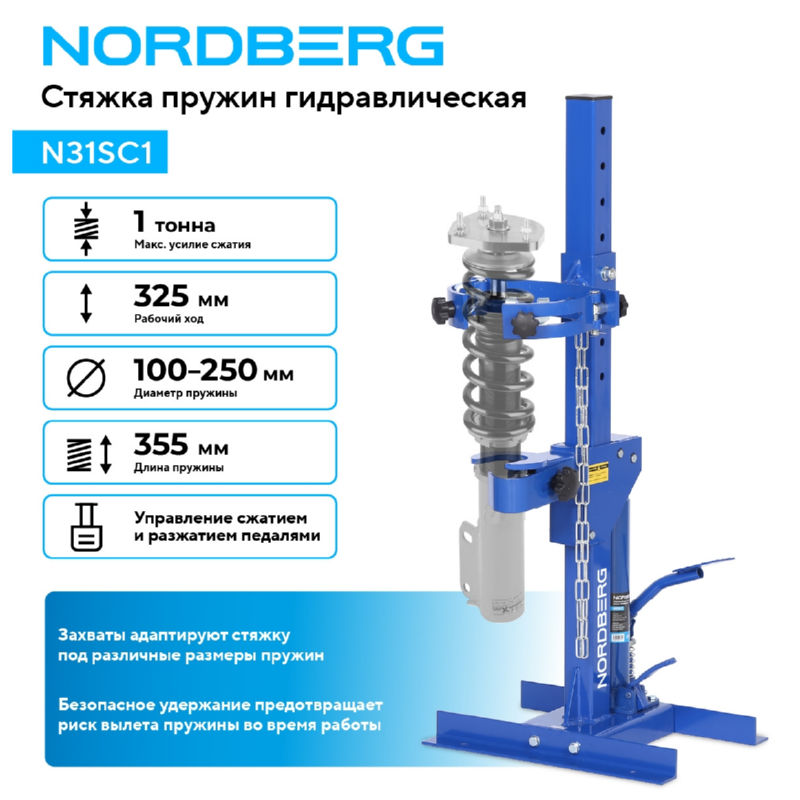 Nordberg N31SC1 – это гидравлическая стяжка пружин, применяемая для безопасного и контролируемого сжатия пружин амортизаторных стоек типа МакФерсон при их разборке, сборке и замене компонентов.