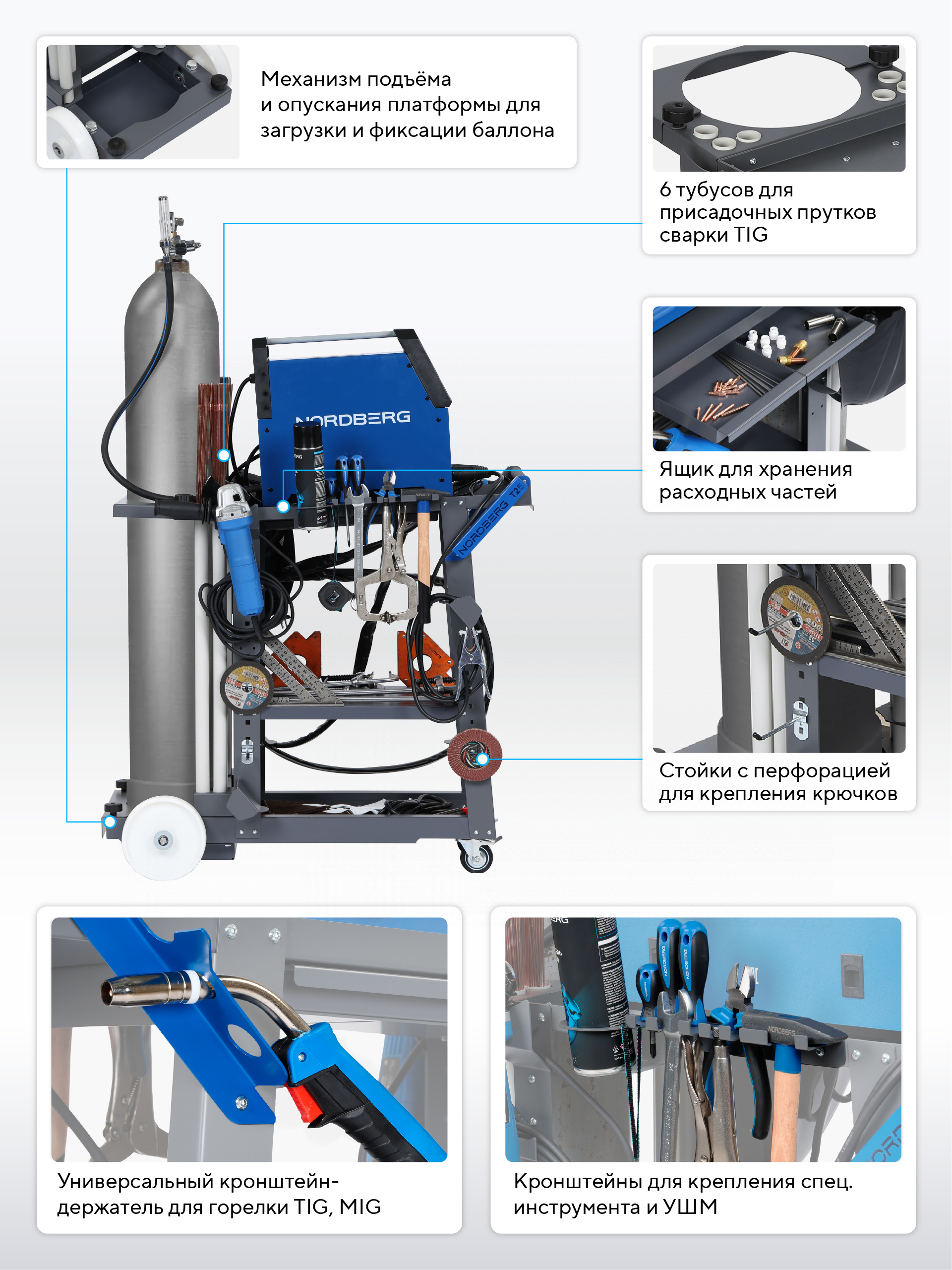 - Шесть тубусов для размещения присадочных прутков сварки TIG