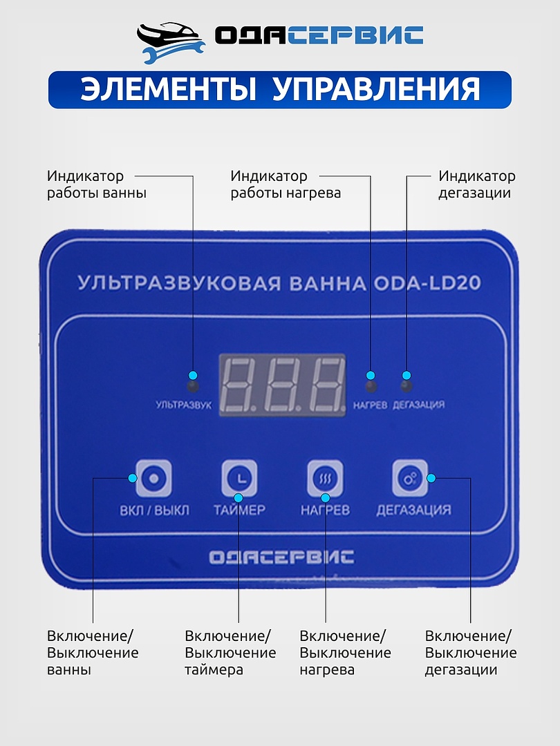 - ОДА Сервис ODA-LD20 это ультразвуковая ванна с ЖК дисплеем, подогревом, дегазацией и таймером позволяющая удалить загрязнения на разнообразных деталях, узлах и инструментах