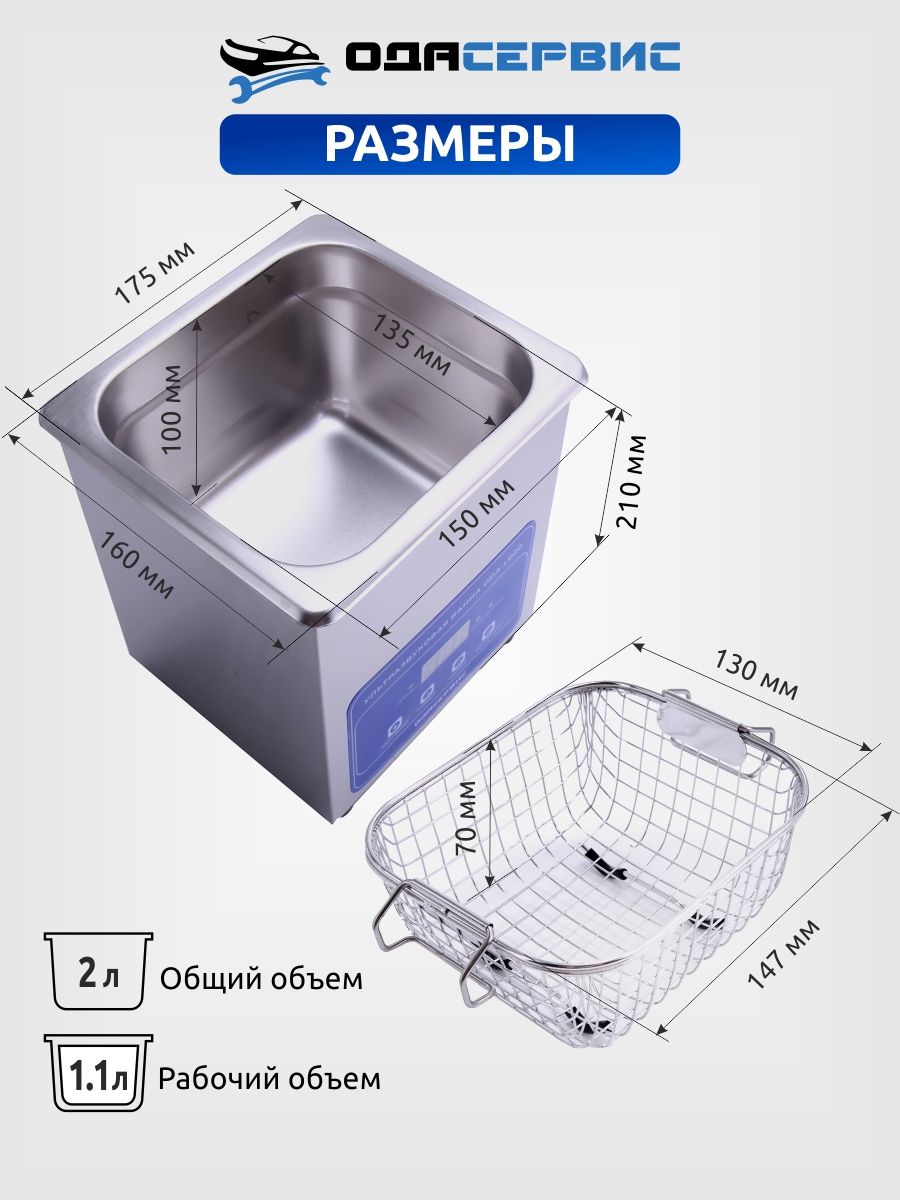 УЗ мойка деталей ОДА Сервис ODA-LD20, нержавеющая сталь, 220 В, 2 л, нагрев 0-80°С, дегазация, рабочий объем 1.1 л 150×138×100 мм, мощность ультразвука 60 Вт, ЖК-дисплей, таймер 60 мин