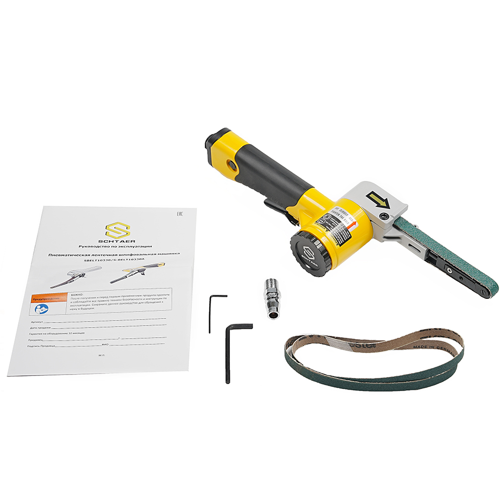 Гарантия производителя — 12 месяцев — подтверждение надёжности и качества сборки. SCHTAER S-BELT10330A — профессиональный пневмоинструмент для тех, кто ценит удобство, производительность и точность в работе с различными материалами и поверхностями.