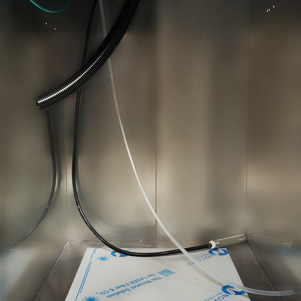Установка требует подачи сжатого воздуха в диапазоне, указанном производителем, и подключения вытяжки.