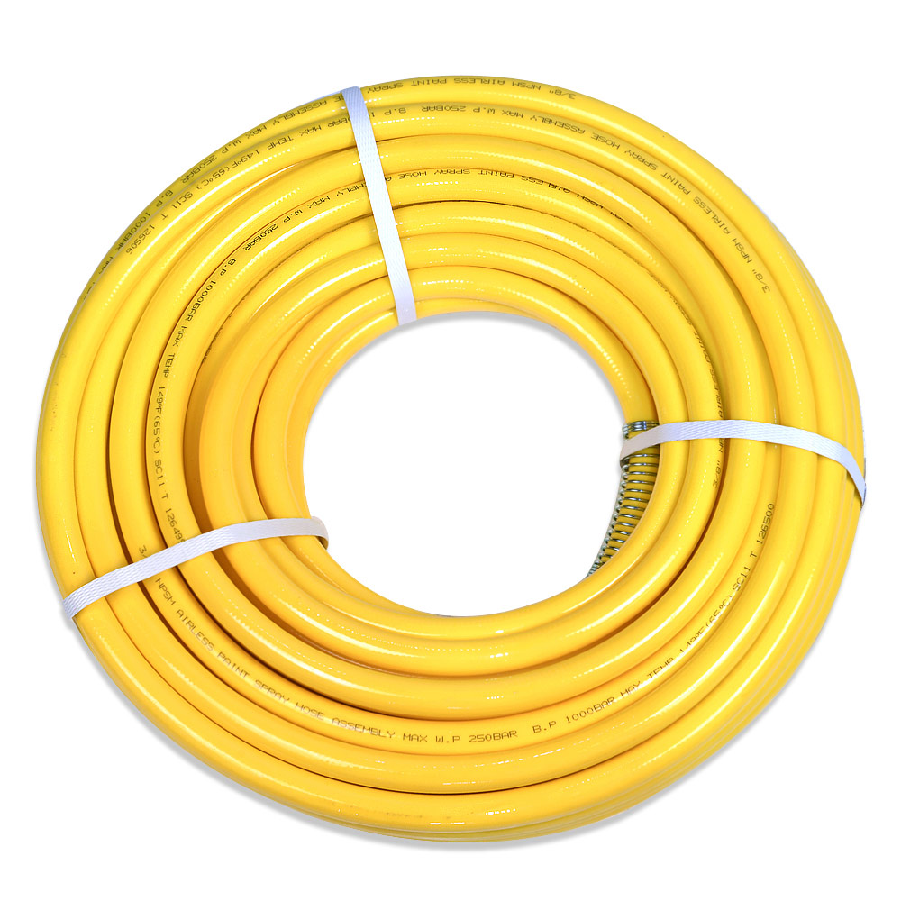 SCH-250-1/2-15-Y – шланг высокого давления для подачи краски от окрасочного аппарата на безвоздушный краскопульт. Шланг сделан с полиамидным сердечником, на концах шланга присоединительные ниппели для прикручивания шланга к краскопульту или к окрасочному аппарату, Для предотвращения перетирания шлангов в местах стыка с концевыми соединительными ниппелями на шлангах стоят пружины.