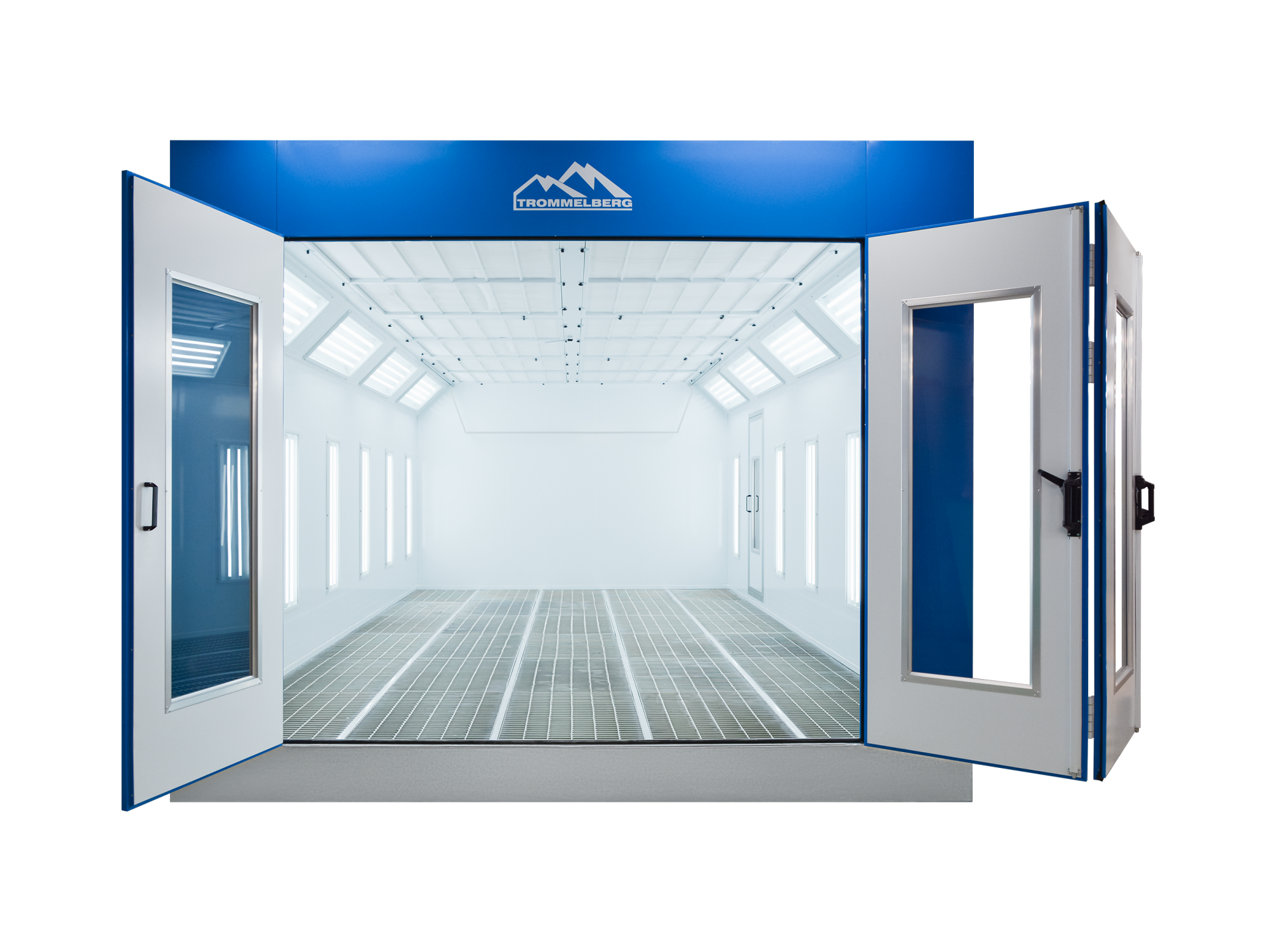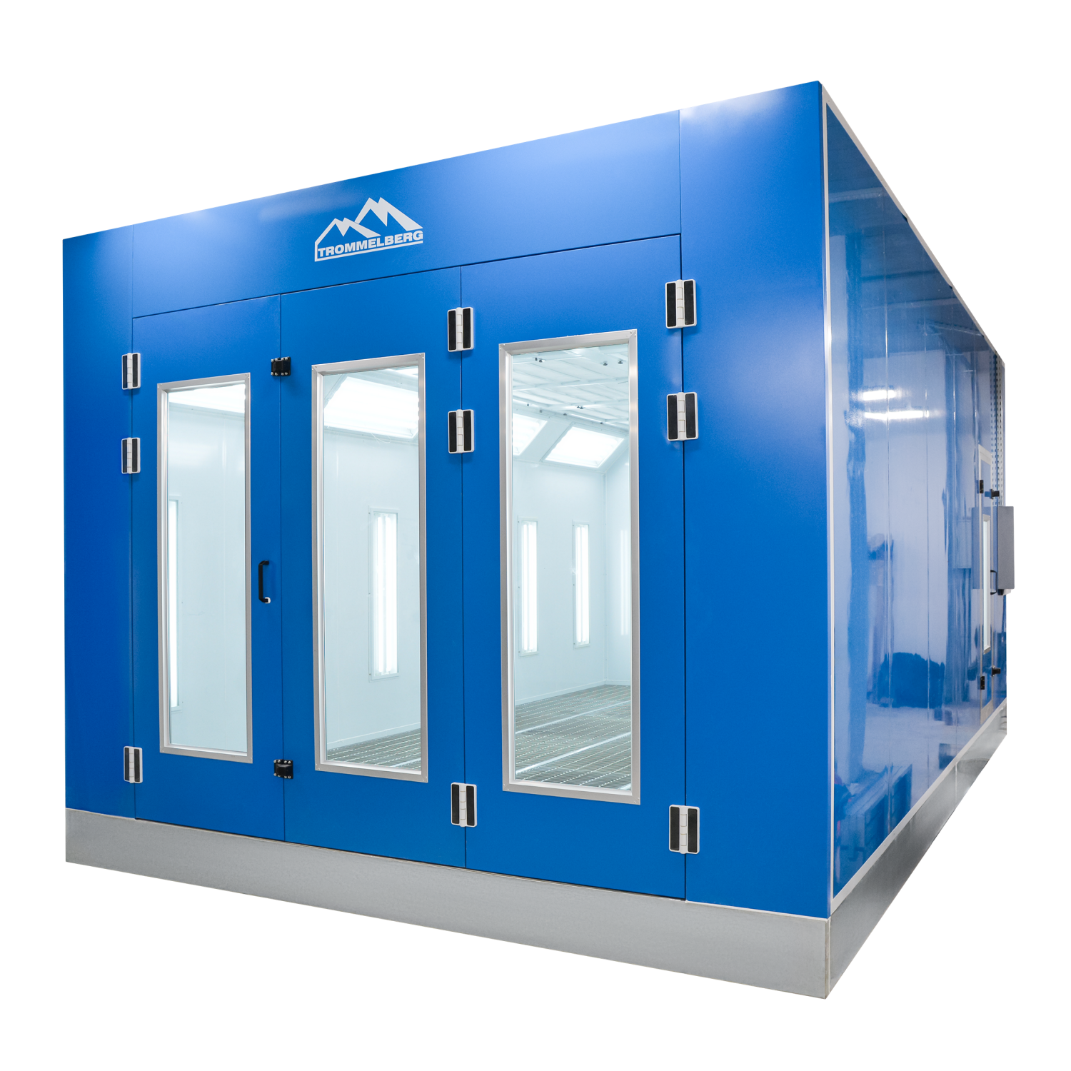 - Профессиональная окрасочная камера Trommelberg SB7427.02, синяя, 380 В, 17.5 кВт, горелка Riello RG5S, верхнее наклонное и боковое освещение, решетчатое основание 300 мм