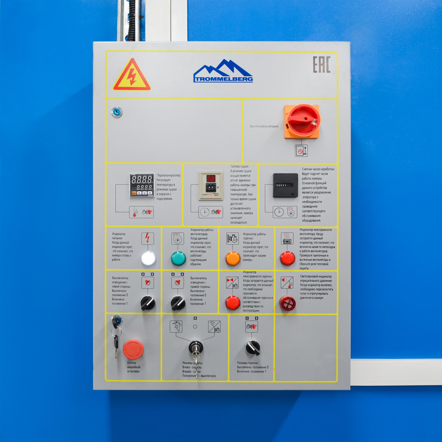 - Пульт управления оснащен индикаторами режимов работ, необходимой рабочей и аварийной сигнализацией, таймером и контроллером температуры в кабине