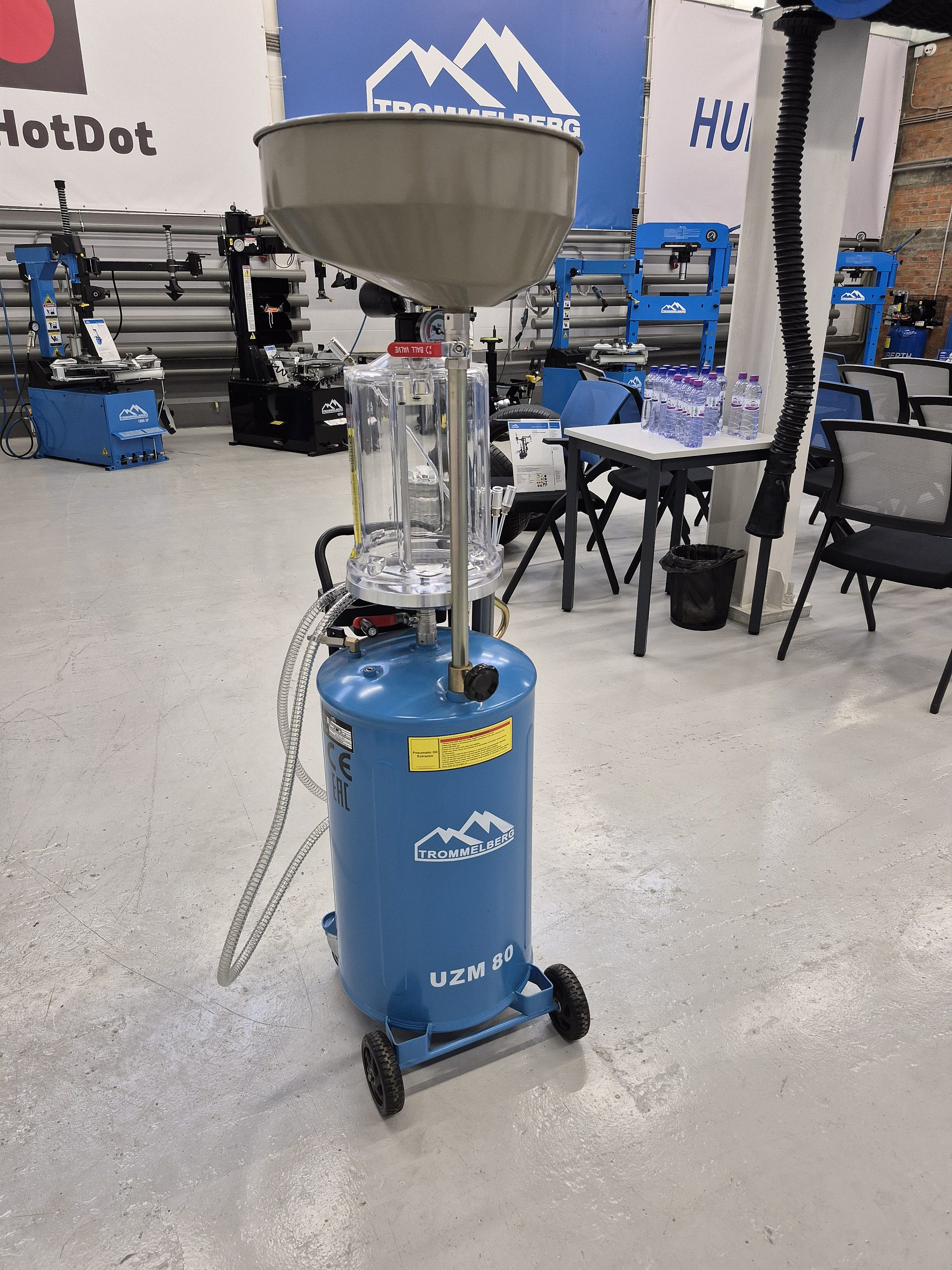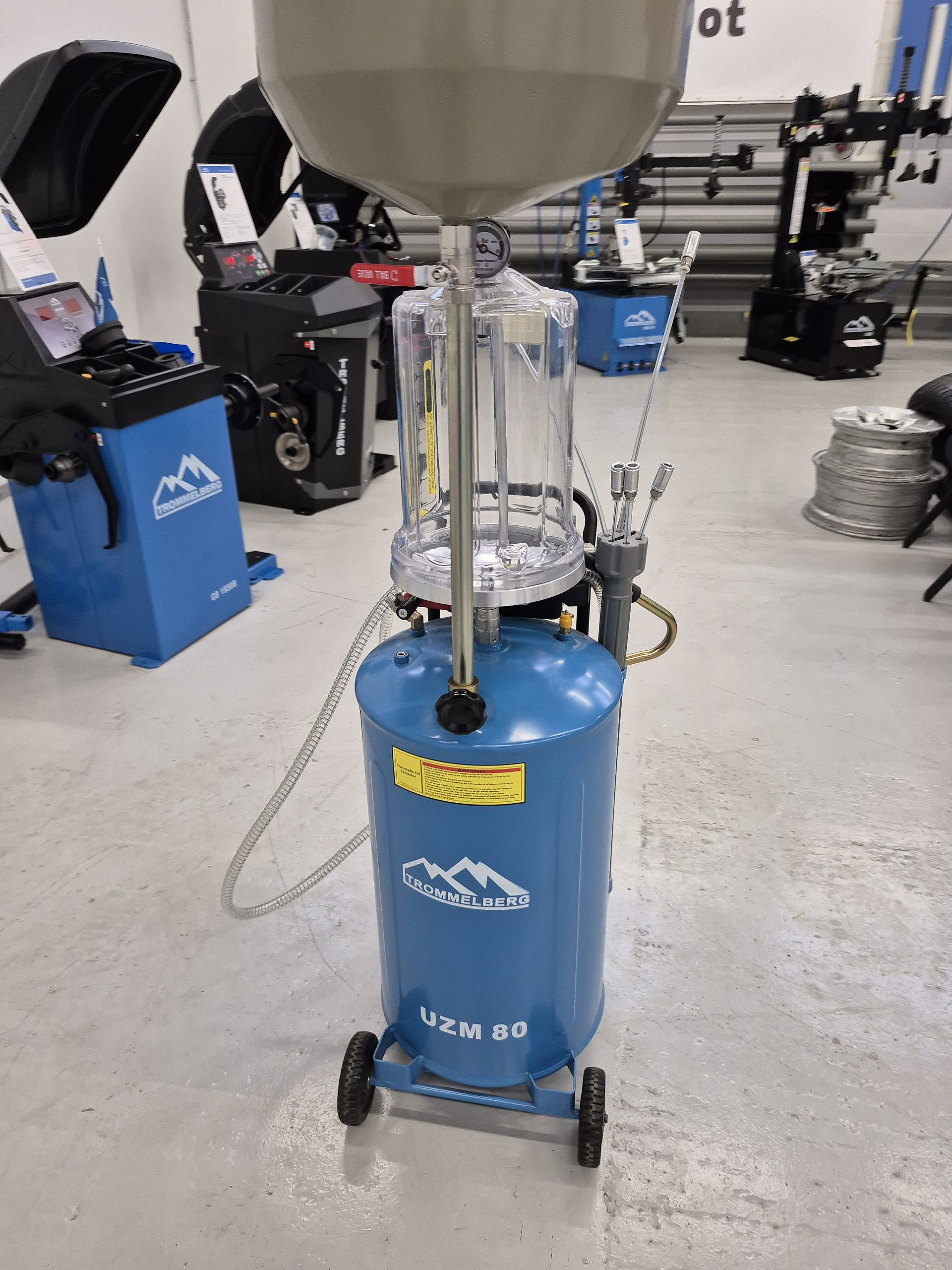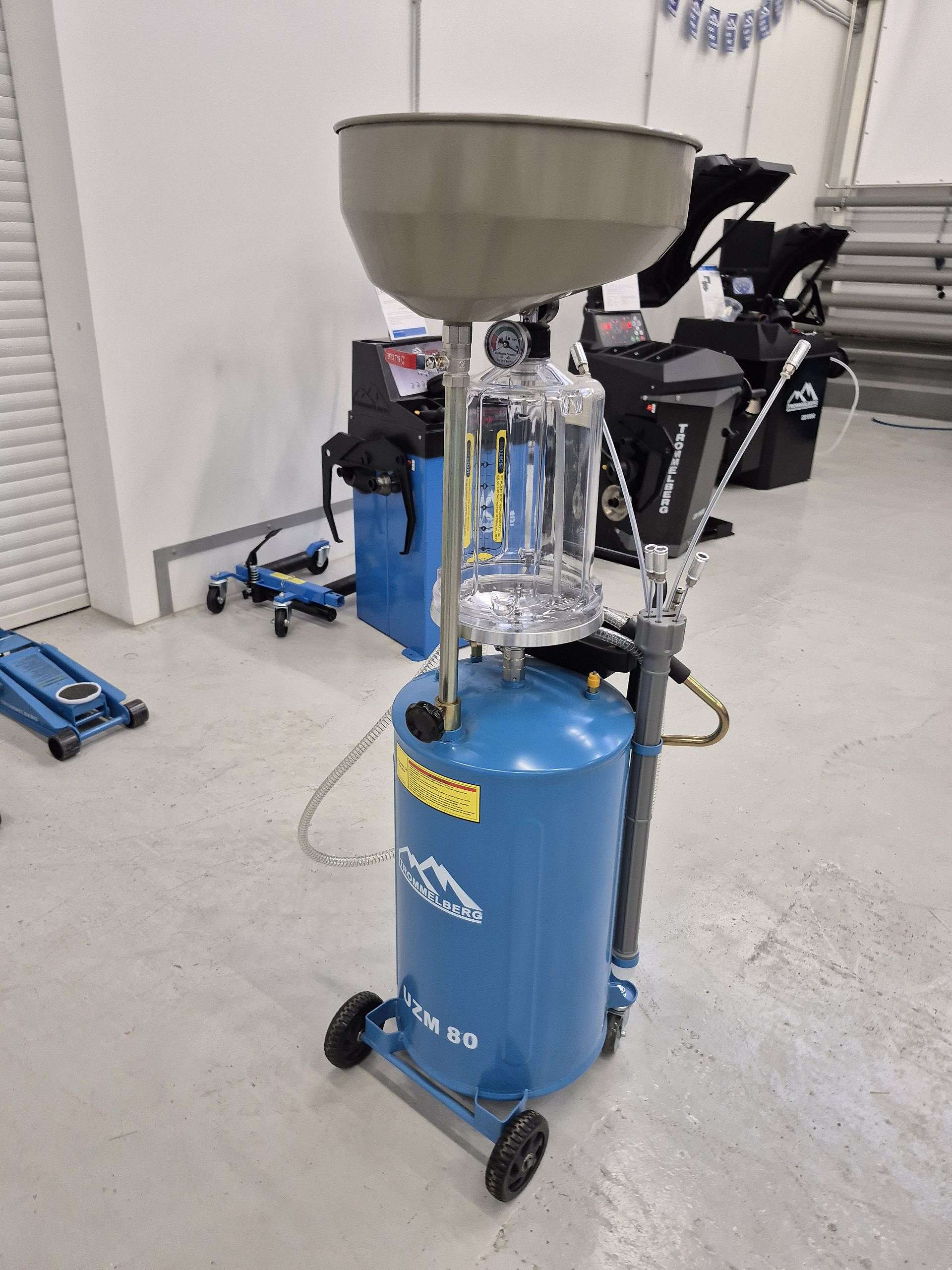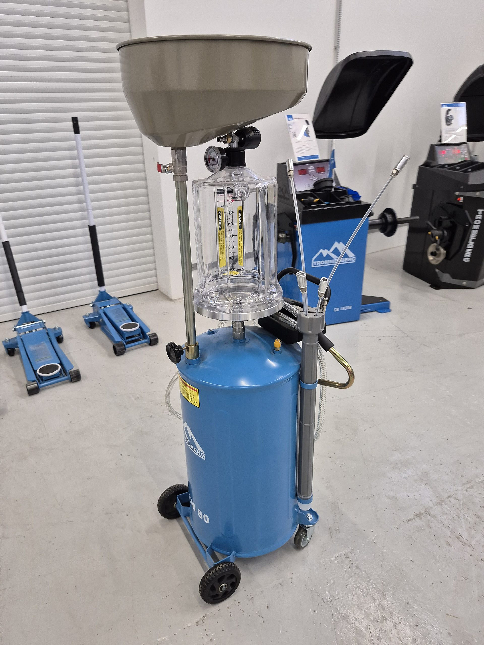 Пневматическая установка для слива и откачки масла Trommelberg UZM80, синяя, мобильная, объем бака 65 л, воронка 13 л, смотровая колба 10 л, расход воздуха 200 л/мин, рабочее давление 6-8 бар, высота до 1680 мм, 6 щупов